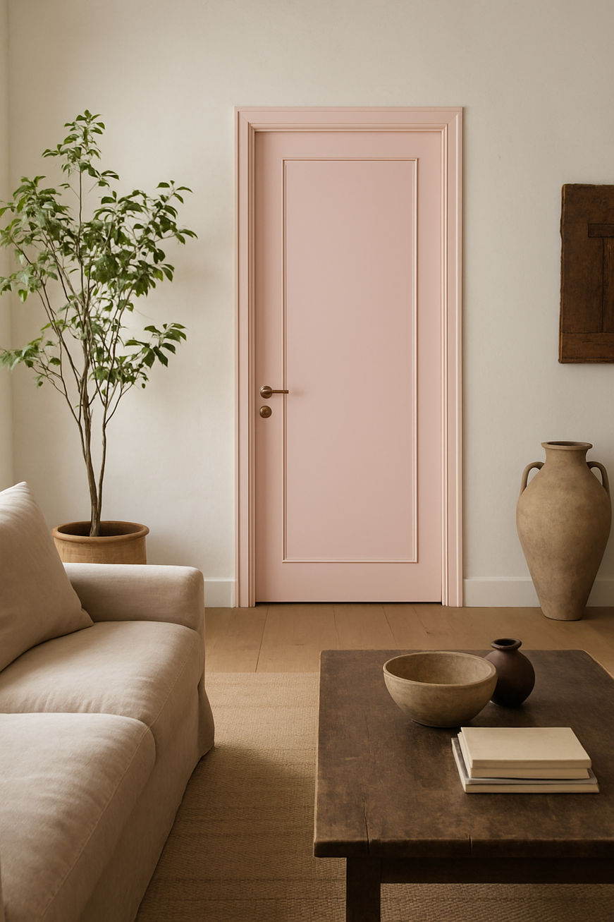 On this calm, painted plane, the metal inlay exists not to decorate, but to "punctuate" and "define." It marks the boundary where space becomes form. The design captures the silent collision between the solid mass of the door and the sharp, reflective precision of the aluminum.